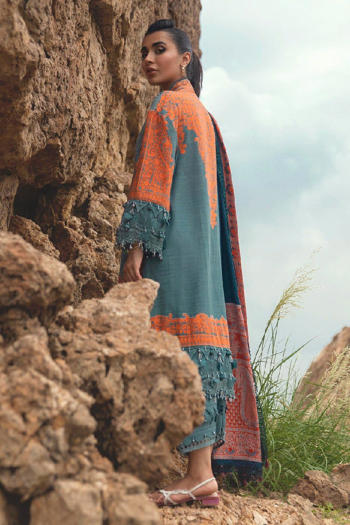 This delicate craftsmanship of Persian embroidery creates a luminous show of beauty in cadet blue and shades of tangerine, imbuing an outfit with a regal aura. finished with matching pants and a fabulous pashmina shawl.