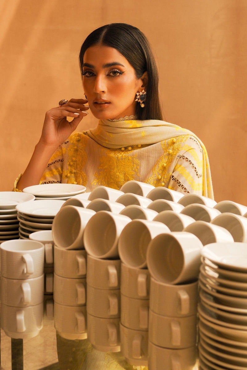 Embroidered with chintz florals and geometric motifs, this ensemble weaves a narrative of artistry and precision. Complementing the intricate details are cotton pants and a printed pashmina shawl, featuring motifs inspired by the ancient art of shibori.