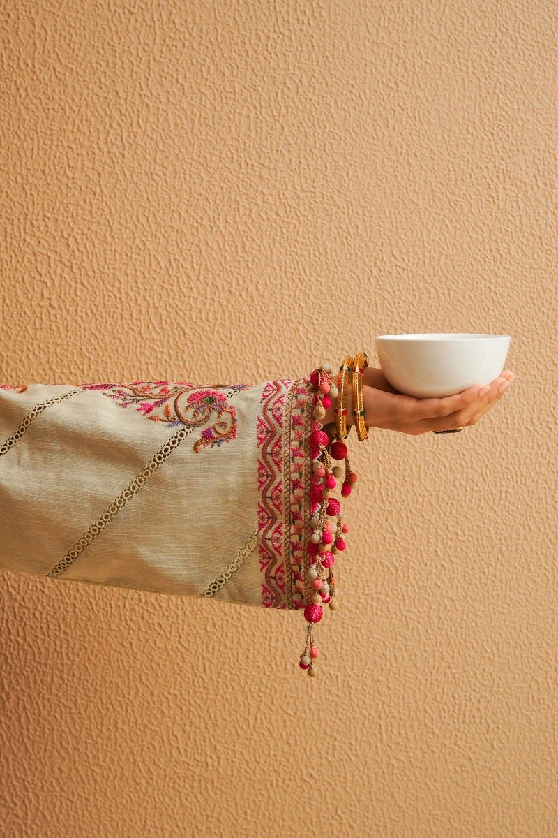 Drawing inspiration from the intricate beauty of Indian paisley, this ensemble weaves a tale of cultural richness. Paired harmoniously with cotton pants that softly speak of simplicity and comfort, and a printed pashmina shawl that exudes the enchanting aura of Mughal charm.
