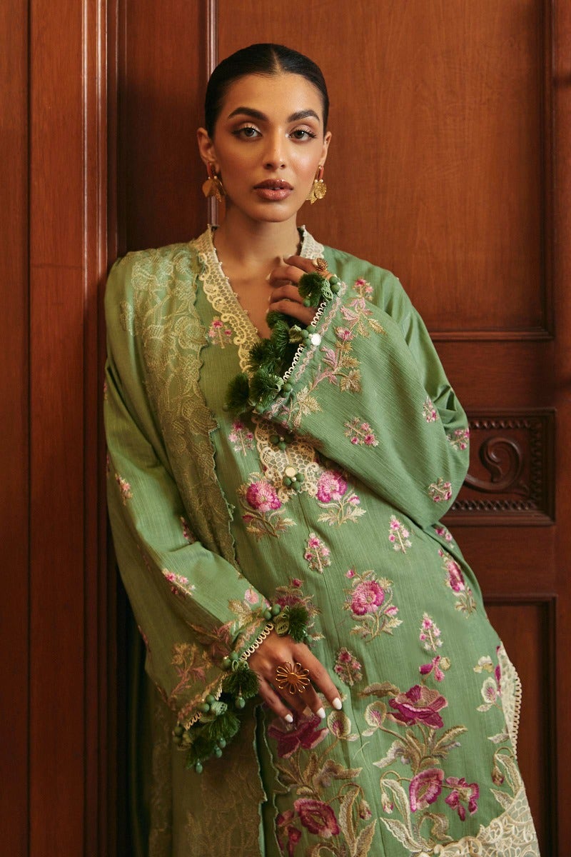 A picturesque blend of delicate indian booti and french lace motifs come together on an slub canvas. The ensemble is completed with a beautiful pashmina shawl that adds a poetic aura, and pants crafted with precision to create a harmonious look.