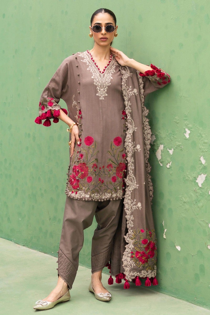 Nature's beauty unfolds in this embroidered silhouette, where delicate motifs celebrate the earth's artistry. Paired with cotton pants and a pashmina shawl, the ensemble displays the charm of a blooming landscape.