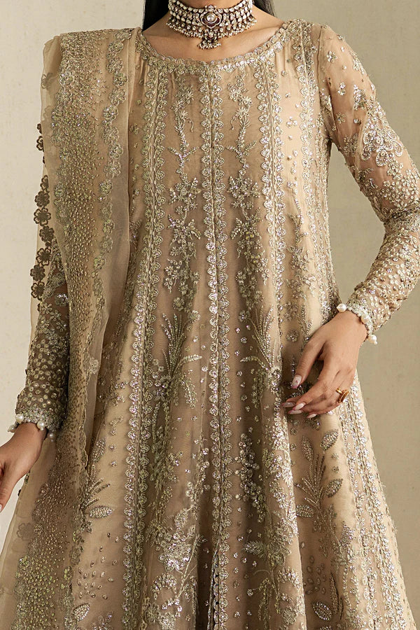 Radiating timeless charm, this champagne-toned organza ensemble is richly adorned with intricate silver embellishments and delicate threadwork that cascade gracefully across the flowing silhouette. The full-length design with sheer embroidered sleeves brings an air of refined sophistication, while the scalloped borders add depth and detail. Paired with a matching organza dupatta, this look embodies understated luxury — perfect for weddings and evening soirées where elegance speaks louder than words.