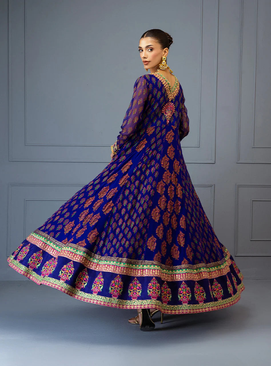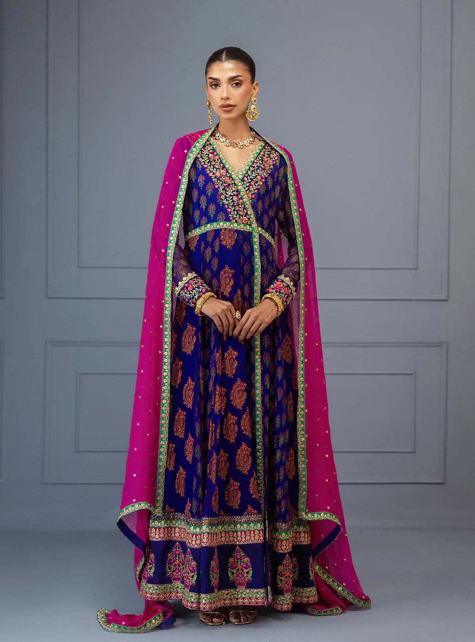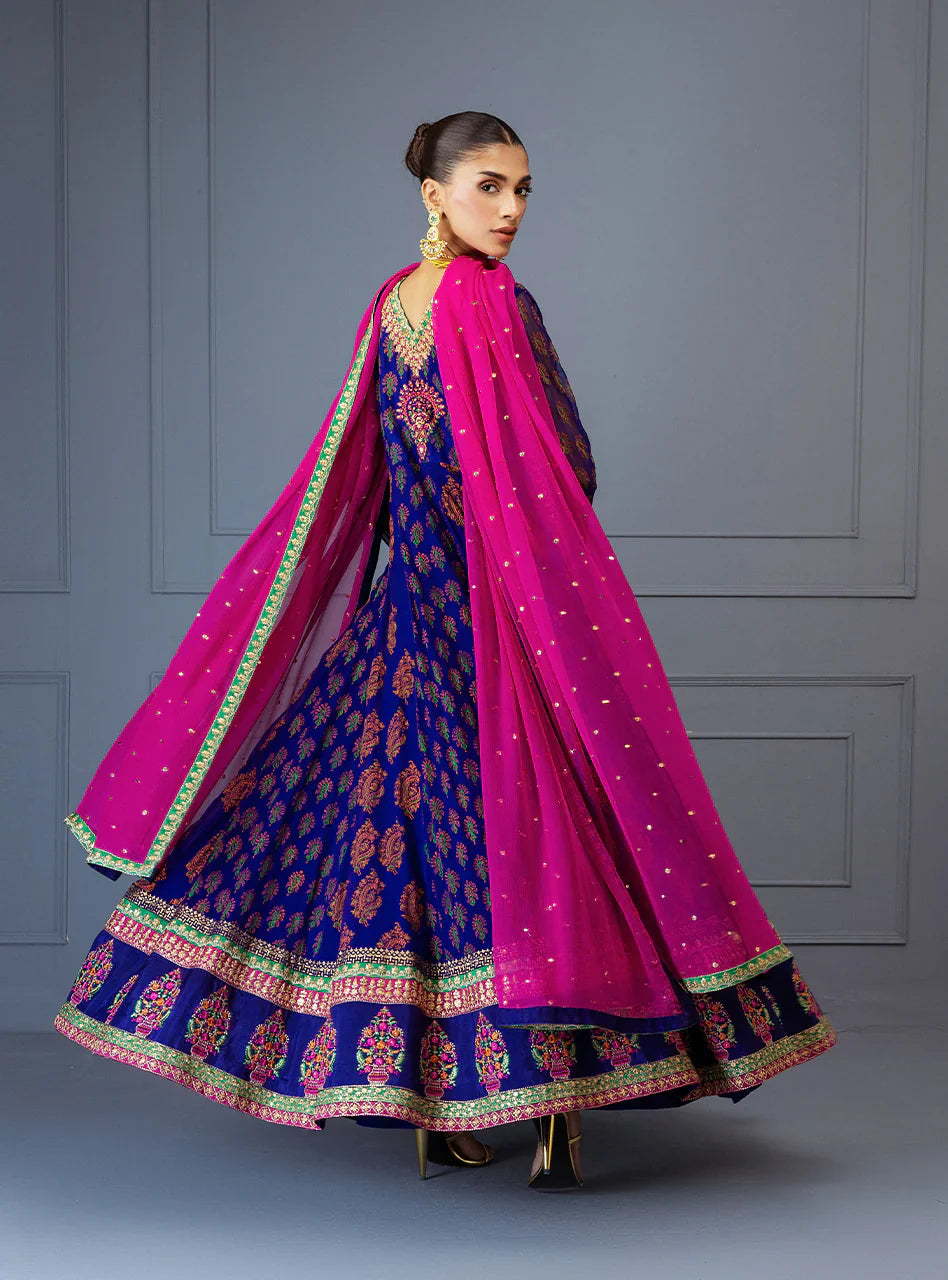 Step into an exclusive realm of style with "Mihirma" a truly unique piece from our Nuriyeh collection. This captivating long violet shirt is brought to life by intricate rust block prints, a testament to timeless craftsmanship. Our signature hand and machine embroidery, thoughtfully detailed on the neckline, sleeves, and the sweeping hem, adds layers of artistic beauty. A scattering of luminous sequin chan provides a gentle sparkle. The ensemble is completed with luxurious emerald green raw silk trousers and a vibrant hot pink chiffon dupatta.
