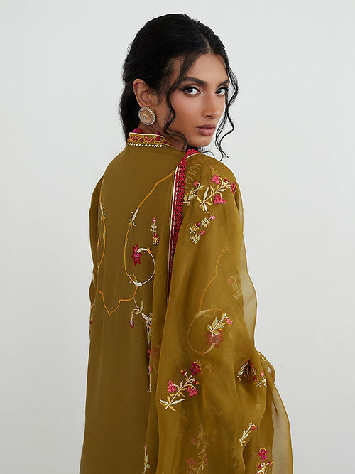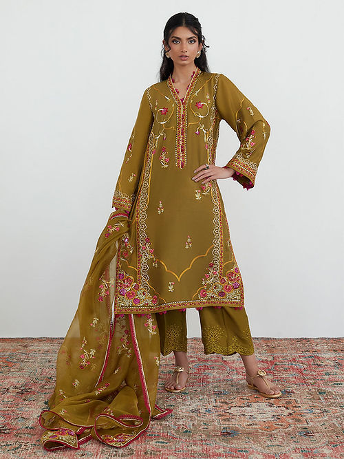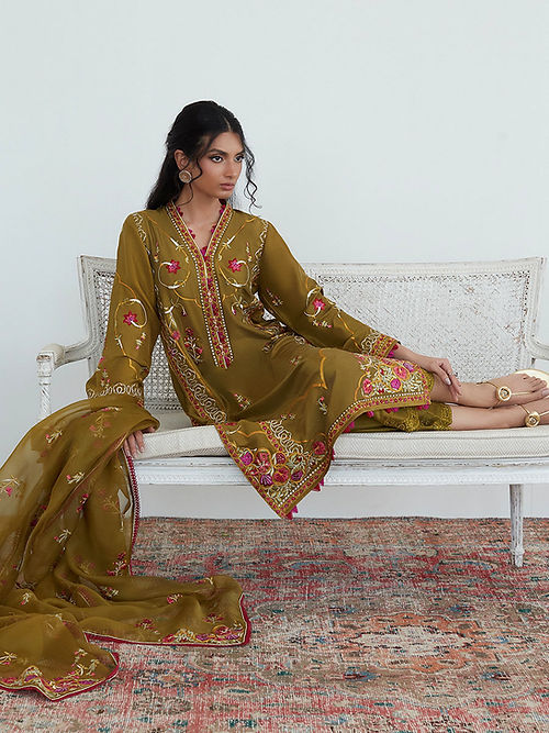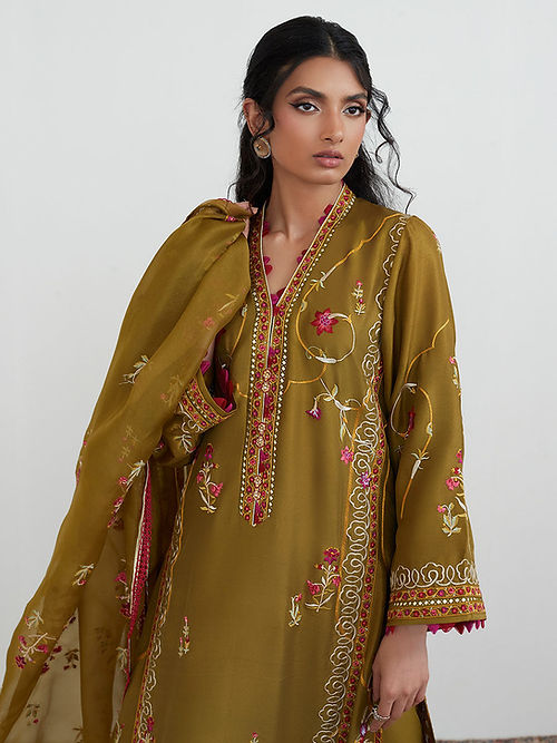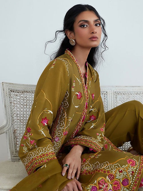 A deep shade of olive raw silk is adorned with stunning composed embroidery all over the front, back and sleeves in shades of off-white, fuchsia pink and coral.