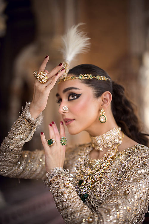 The ivory organza dupatta features sequin and motif embroidery, perfectly complementing the allover embroidery and embellishments on the bodice and sleeves. With the satin silk belt adding a finishing touch, 'Moti' is a testament to timeless beauty and the artistry of bridal elegance.