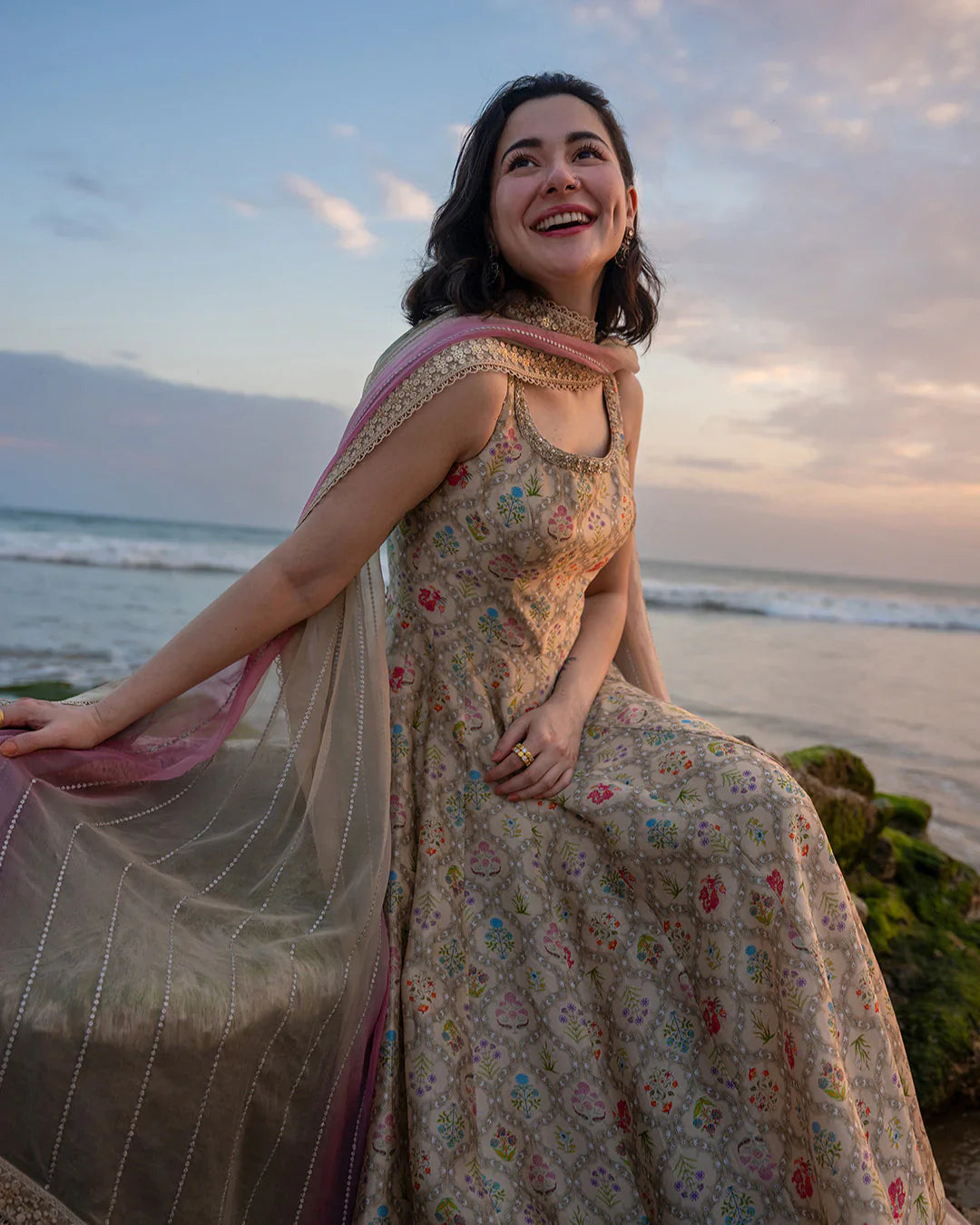 Embodying grace, Naavah is an exquisite classic. Crafted from luxe silk on a beautiful beige and multi-hued canvas, the embellished and embroidered pishwas showcases artistically arranged sequin and moti patterns. Paired with a silk churidar and an embroidered chiffon dupatta, this piece is a truly versatile number that you will cherish for years.