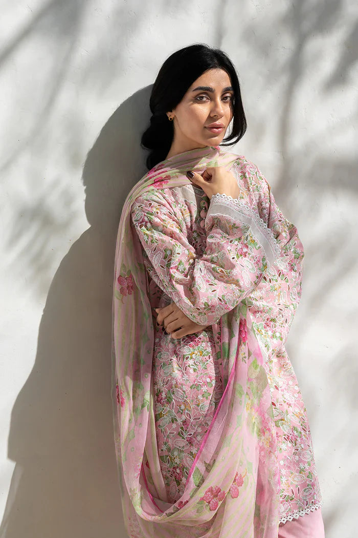 Softly romantic in mood, a blush jacquard lawn shirt is adorned with floral motifs intricately worked in ivory thread embroidery, forming a continuous floral lattice across the surface. Organza inlay and geometric threadwork define the neckline, while embroidered borders finish the sleeves and hem. A plain matching jacquard lawn shalwar completes the look, detailed with delicate lace accents along the hem. The ensemble is paired with a sheer chiffon dupatta, carrying a gentle floral composition in blush and fresh green tones.