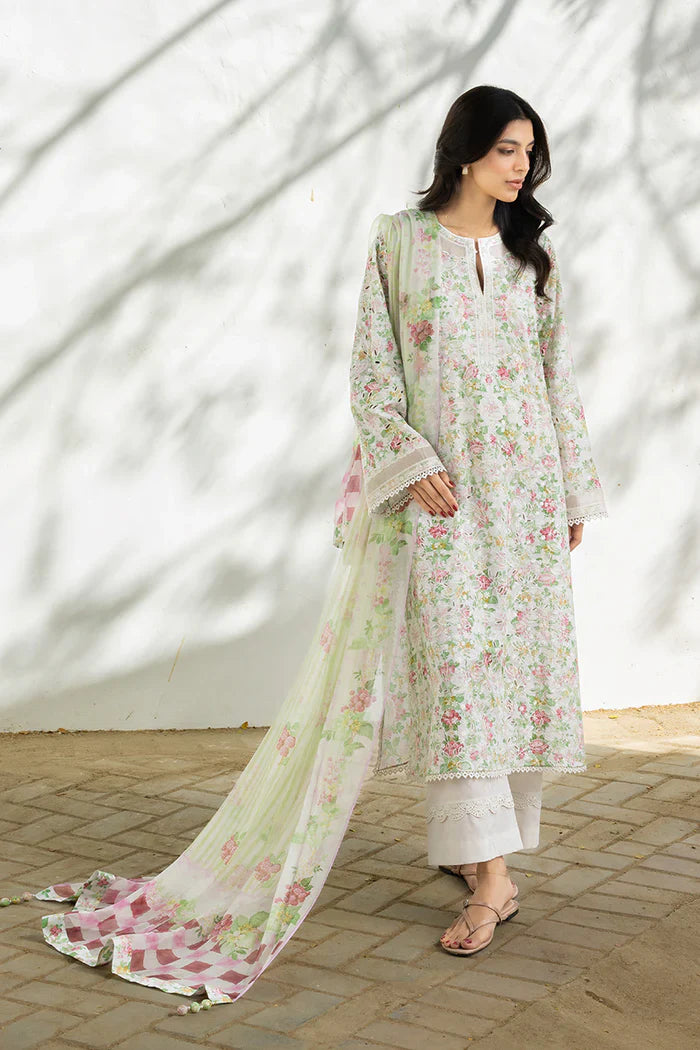 Understated and ethereal, an ivory jacquard lawn shirt is adorned with floral motifs intricately worked in ivory thread embroidery, forming a continuous floral lattice across the surface. Organza inlay and geometric threadwork define the neckline, while embroidered borders finish the sleeves and hem. A plain matching jacquard lawn shalwar completes the look, detailed with delicate lace accents along the hem. The ensemble is paired with a sheer chiffon dupatta, carrying a soft floral composition in ivory and fresh green tones.