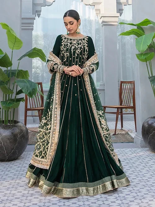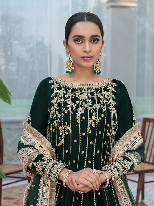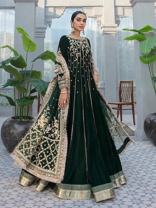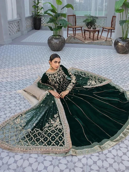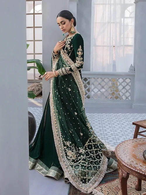 A three piece daintily embellished emerald pishwas featuring traditional handwork on a bed of starry sequin spray. The look is completed with a fully sprayed and embellished dupatta.