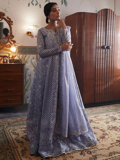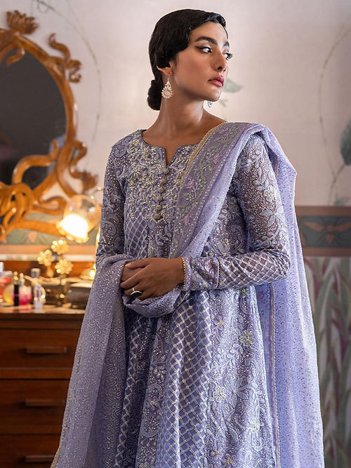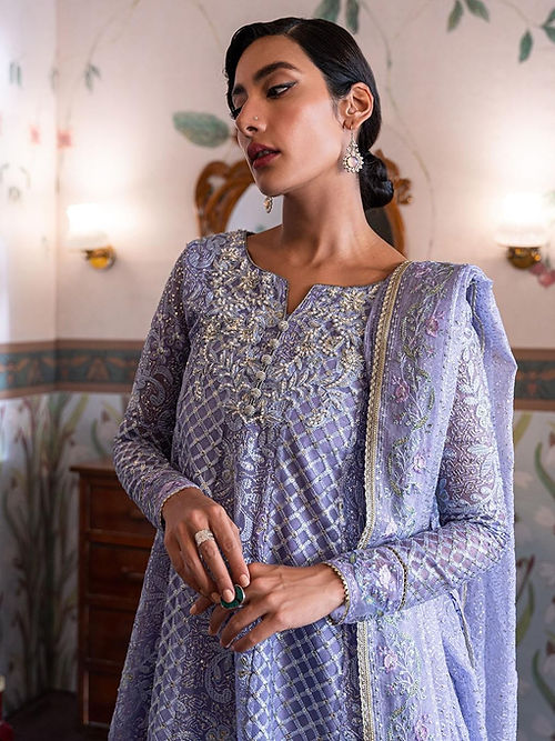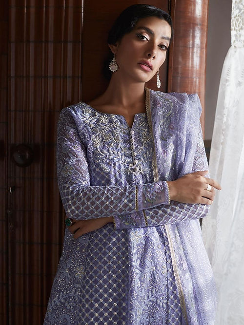 Neha, a spellbinding lavender outfit that exudes grace and sophistication, is a true masterpiece in the realm of fashion. This enchanting ensemble features an embroidered sequin and hand-embellished neckline on delicate organza net, creating a stunning display of opulence and elegance. With meticulous craftsmanship and exquisite finishing touches, Neha is destined to leave a lasting impression.