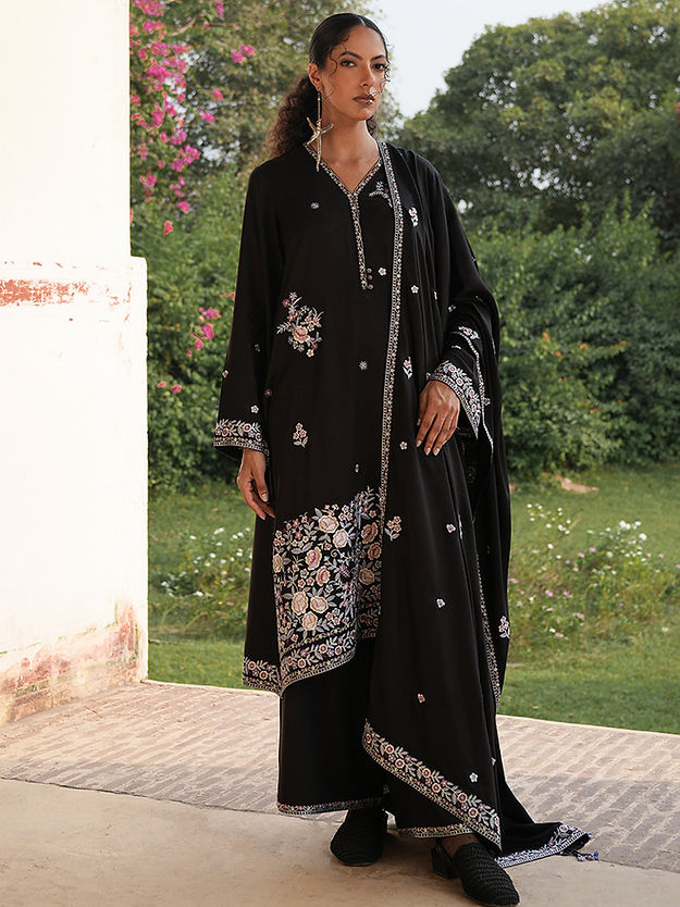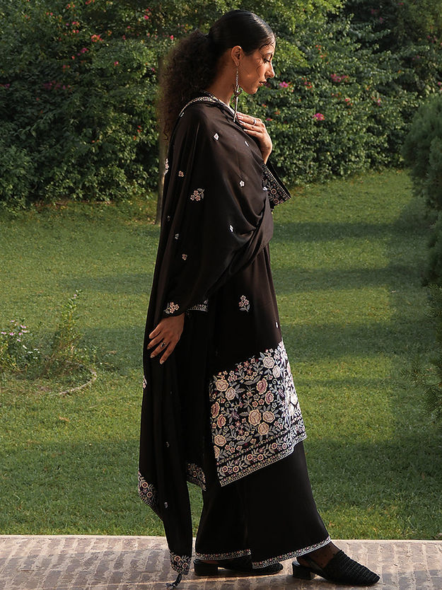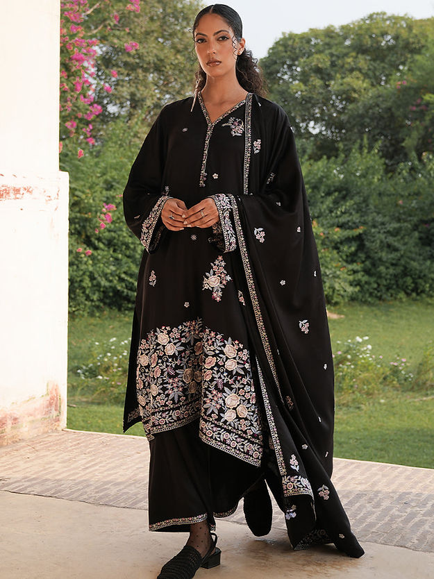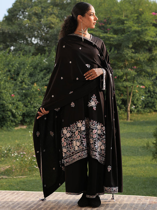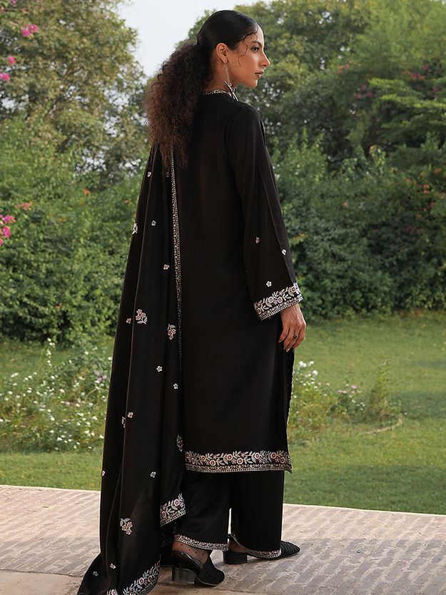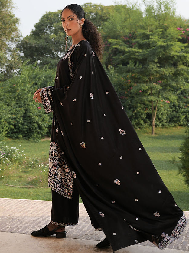 Nevra in Black from our Winterkari '24 Collection. An embroidered navy twill viscose 3-piece outfit paired with light powder blue embroidered dupatta.​