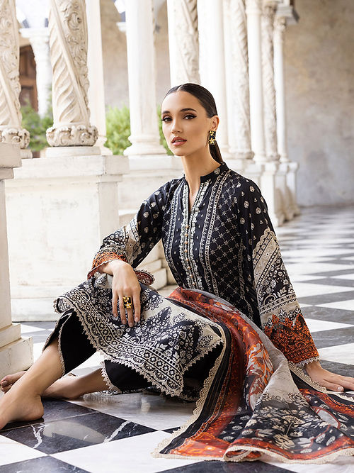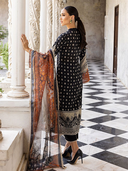 A Monochrome Canvas Adorned With Floral Prints Is Elegantly Enhanced By Delicate Embroidered Necklines And Complemented With Contrasting Dupatta, Creating A Seamless Ensemble Suitable For Both Day And Night Gatherings.