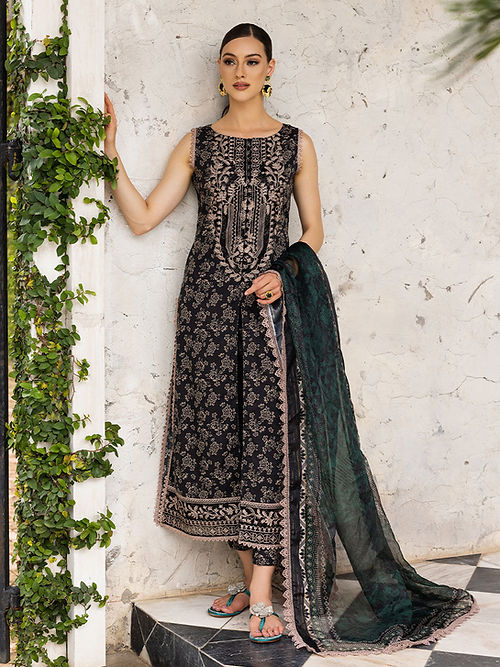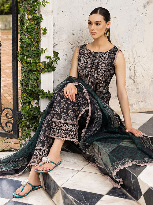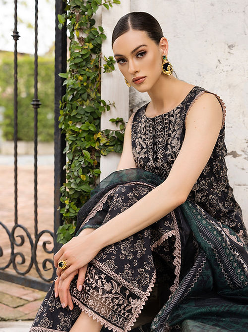A Monochrome Canvas Adorned With Floral Prints Is Elegantly Enhanced By Delicate Embroidered Necklines And Complemented With Contrasting Dupatta, Creating A Seamless Ensemble Suitable For Both Day And Night Gatherings.