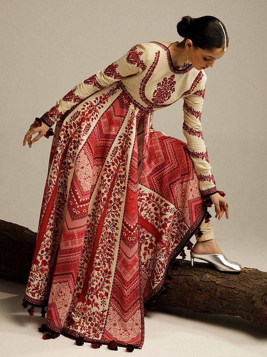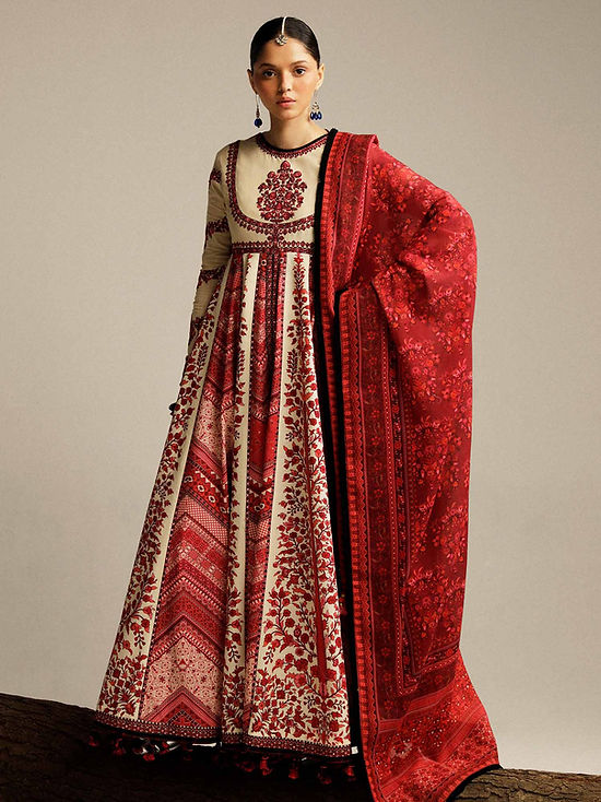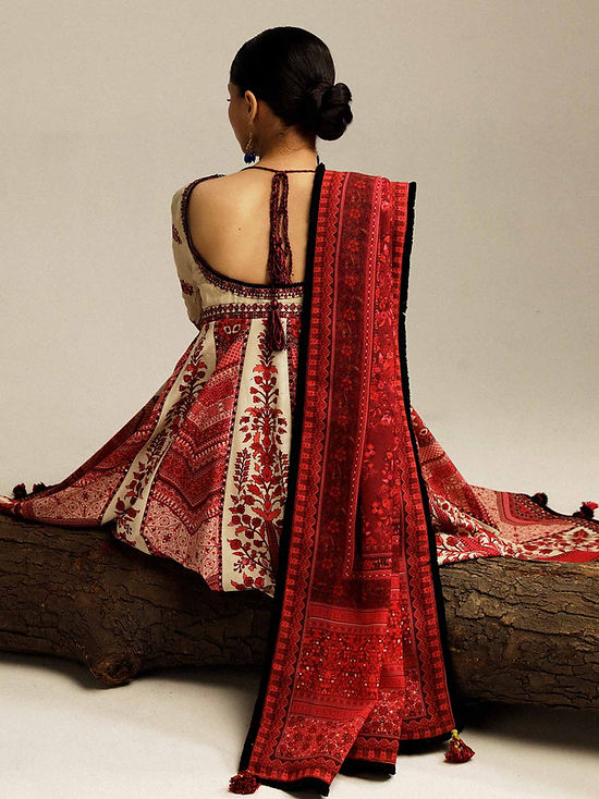 An elegant ivory-colored pishwas with a front open design. The bodice and borders are exquisitely embroidered with shades of red and black, adding a touch of richness and depth. The outfit also features printed panels that enhnaces its visual appeal. It is paired with a stunning self-print design woolen shawl that perfectly complimetns the outfit.