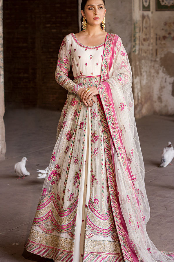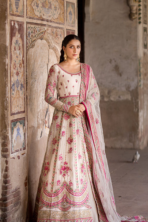 An exquisite ensemble that epitomizes elegance. This off-white, front-open maxi is crafted from sumptuous organza and adorned with striking shocking pink and turquoise embroidery. Paired with a raw silk lehenga, it boasts delicate boti spray embellishments that add a touch of grace. The look is completed with an organza dupatta, featuring intricate chata pati detailing along all four sides, enhancing the refined sophistication of this luxurious outfit.