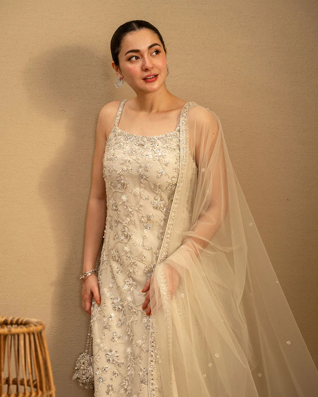 Embodying finesse, Penina harnesses an alluring sophistication. Crafted on an off-white canvas, the silk shirt and Korean Raw Silk culottes feature intricately adorned stone, sequin and pearl embellishments. Paired with an embellished net dupatta, this piece will truly add a festive cheer to your celebrations.