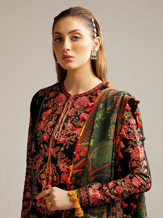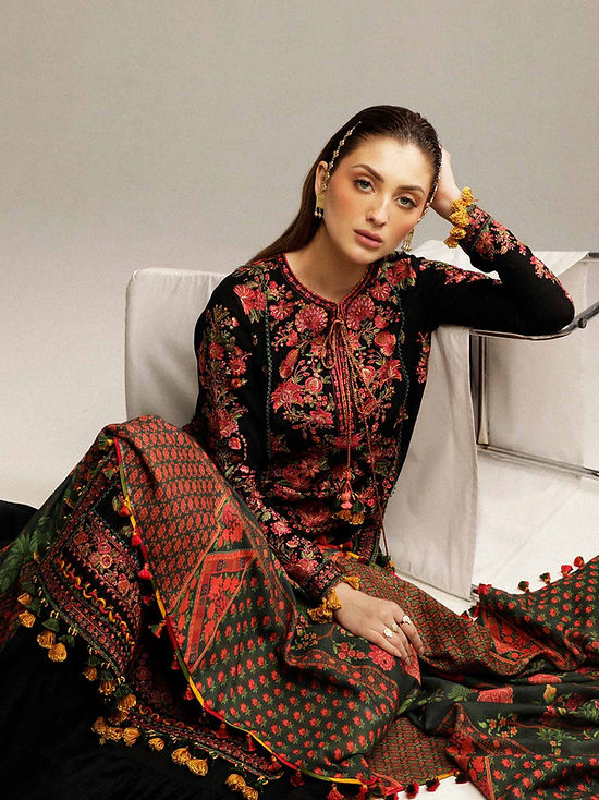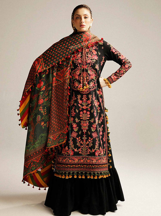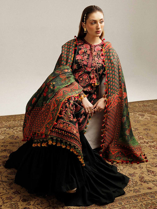 A chic black khaddar outfit that will definitely make heads turn. The black base of fabric acts as a cnavas for the beautiful mustard and pink motifs that bring a vibrant pop of color. To elevate the look its paired with a green printed woolen shawl for added flair. This outfit surely is a vision of beauty and grace.