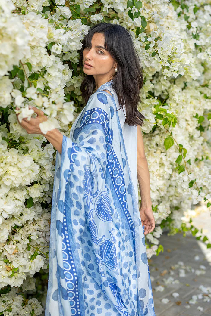 Cool and composed in mood, a soft powder blue jacquard lawn shirt is enriched with refined botanical embroidery, accented by playful pomegranate motifs in deeper tones across the surface. Delicate geometric embroidery defines the neckline with subtle precision. A statement medium silk dupatta in layered shades of powder blue and deep navy introduces bold geometric forms interspersed with stylised pomegranate elements, framed by a contrasting border for graphic impact. The look is completed with matching jacquard cotton culottes, finished with an embroidered hem.