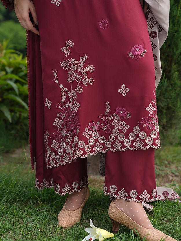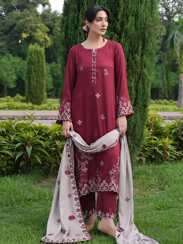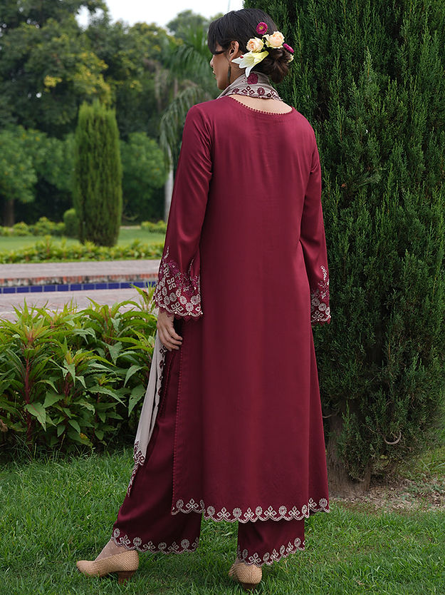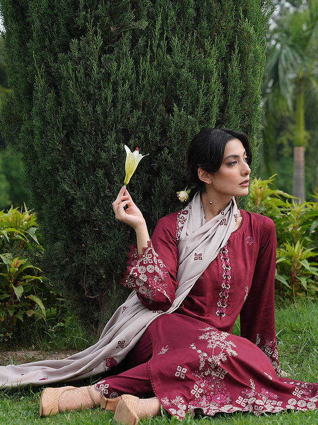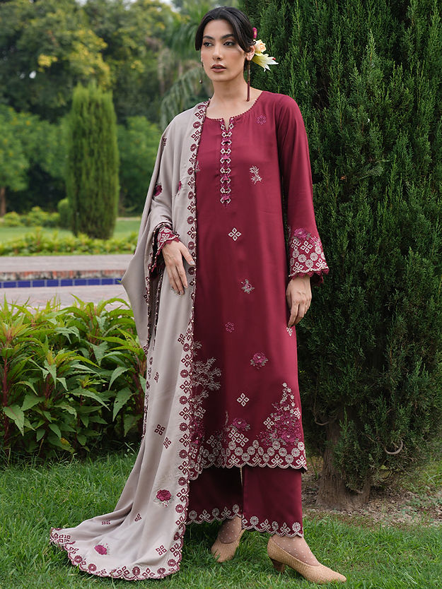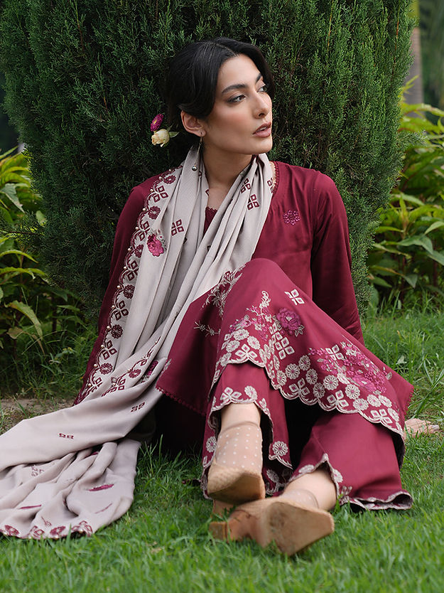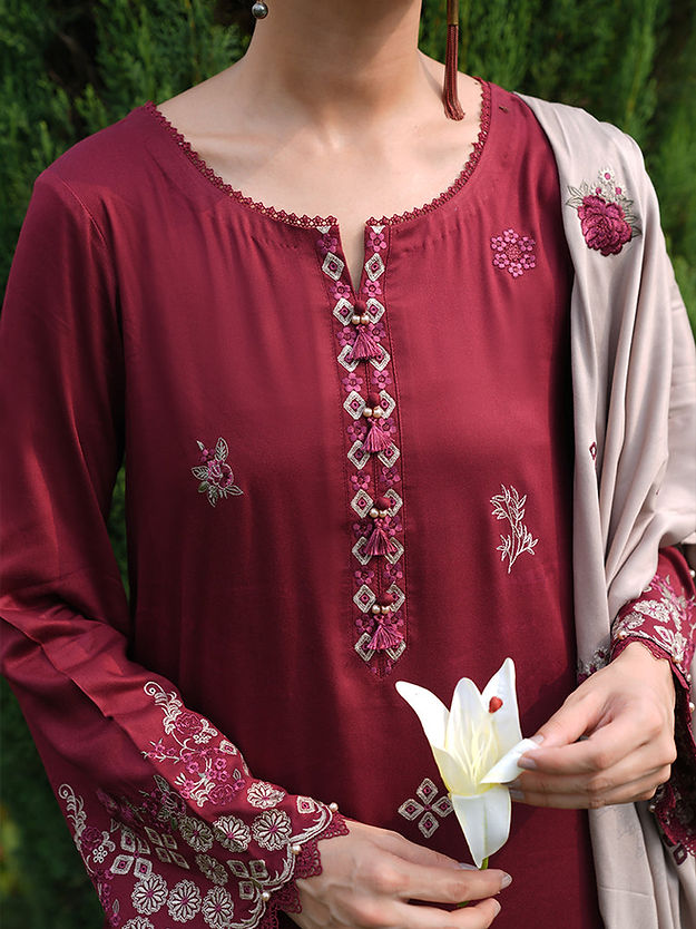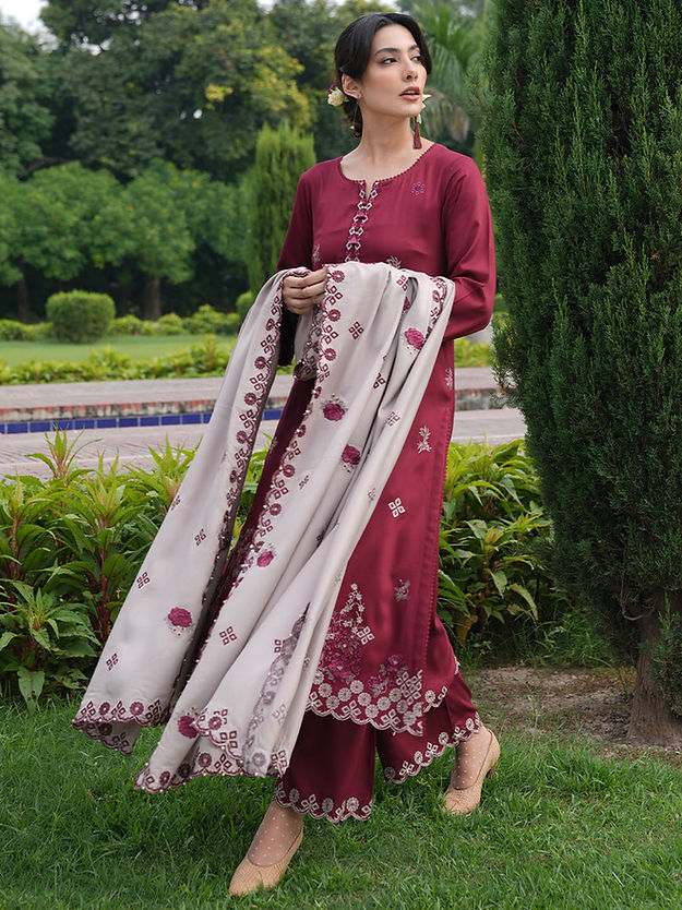 Rivah in Fire/Biscuity from our Winterkari '24 Collection. An embroidered fire twill viscose 3-piece outfit paired with biscuity twill viscose dupatta.​