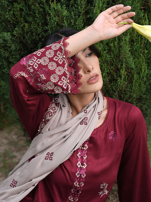 Embroidered Twill Viscose Dupatta With Embroidered Pallu Border