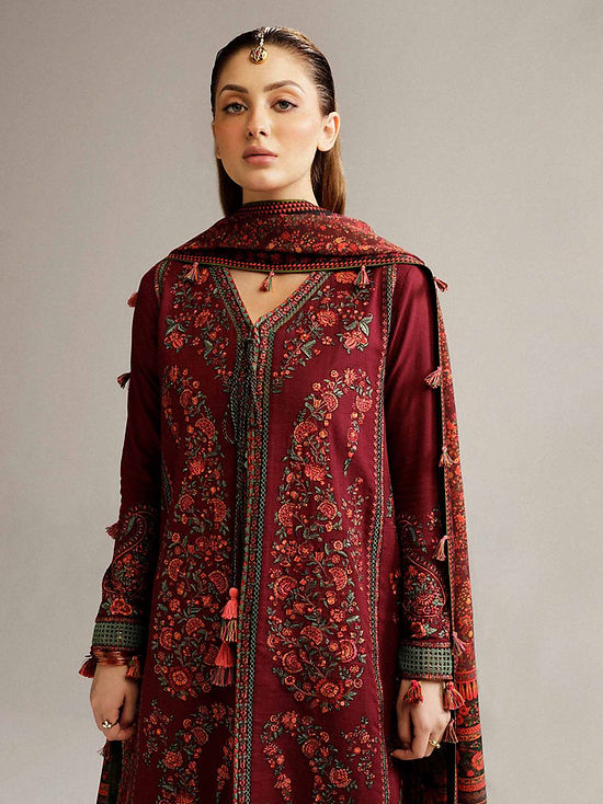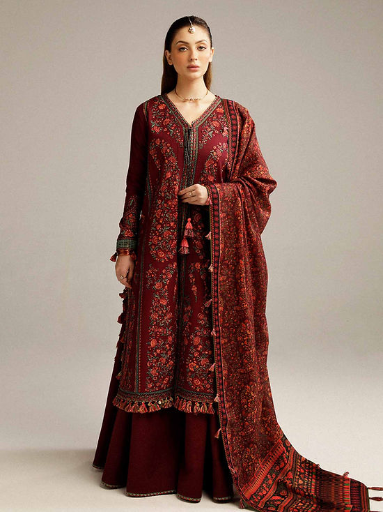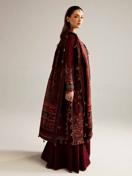 A resplendent burgundy khaddar ensemble adorned with intricate embroidery. This is a true blend of artisty and tradition, with the paisely charm running all over the outfit. This four panelled jacket is paired with a printed woolen shawl that equally compliments the ensemble making it hard for anyone not to notice .