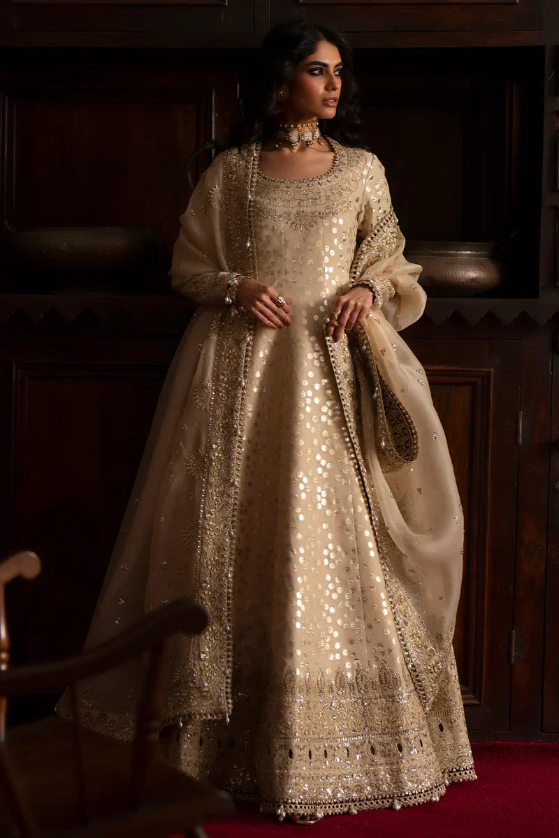 Elevate your style with our pale gold Kaalidaar dress made from luxurious Zari silk, featuring stunning embroidery. Paired with chic sharara pants, this ensemble effortlessly blends tradition and modern flair. Complete the look with a beautifully embroidered organza dupatta that adds a touch of elegance. Perfect for special occasions, this dress will make you shine