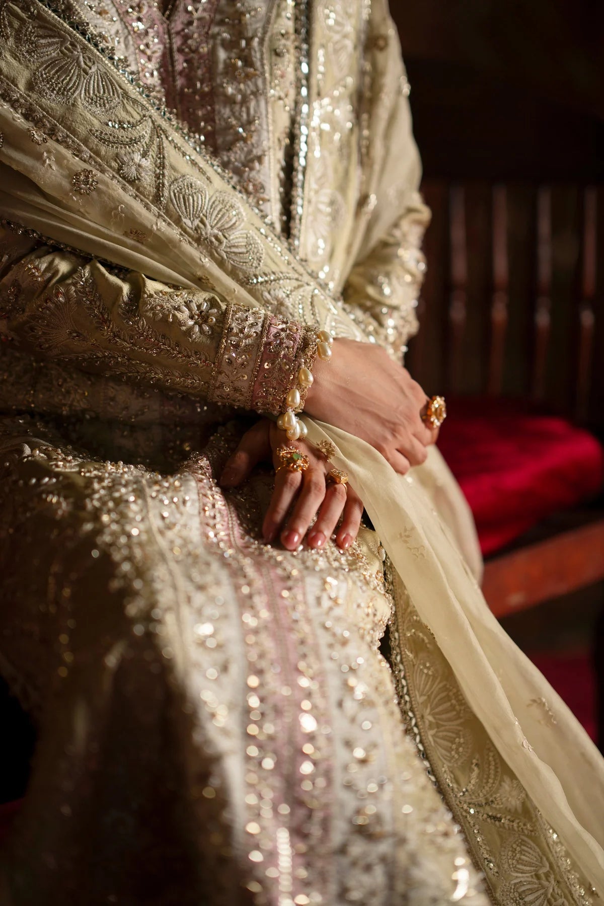 A stunning long pastel olive shirt on luxe tassel silk, adorned with delicate embroidery and intricate handwork. The design is elevated with elegant color-blocking side details, making it truly eye-catching. Paired with a beautifully embroidered dupatta and finely crafted handworked sharara pants, this ensemble blends grace with timeless artistry.