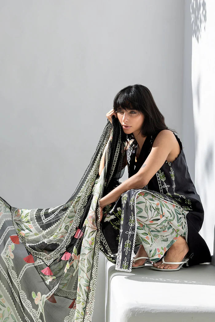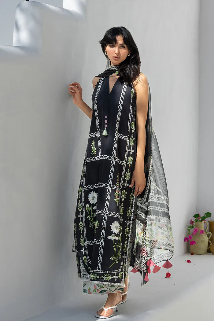 Timeless and poised, an ebony jacquard lawn shirt features eyelet paneling and fine ivory embroidery arranged in a grid inspired layout across the front and sleeves, with floral motifs set within the eyelet framework and a softly scalloped neckline. The printed, cream hued cotton culottes are detailed with trailing botanical elements in coral and green tones. A sheer chiffon dupatta completes the ensemble with a coordinating botanical composition on an ebony and cream canvas.