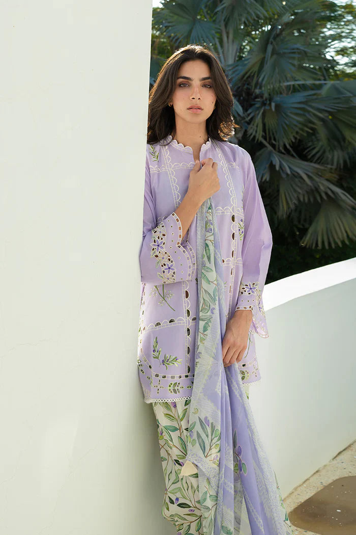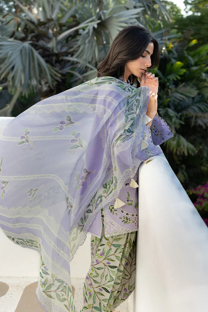 Timeless and poised, a lilac jacquard lawn shirt features eyelet paneling and fine ivory embroidery arranged in a grid inspired layout across the front and sleeves, with floral motifs set within the eyelet framework and a softly scalloped neckline. The printed, cream hued cotton shalwar carries trailing botanical elements in complementary lilac and green tones. A sheer chiffon dupatta completes the look with a coordinating botanical composition in lilac and refreshing green.
