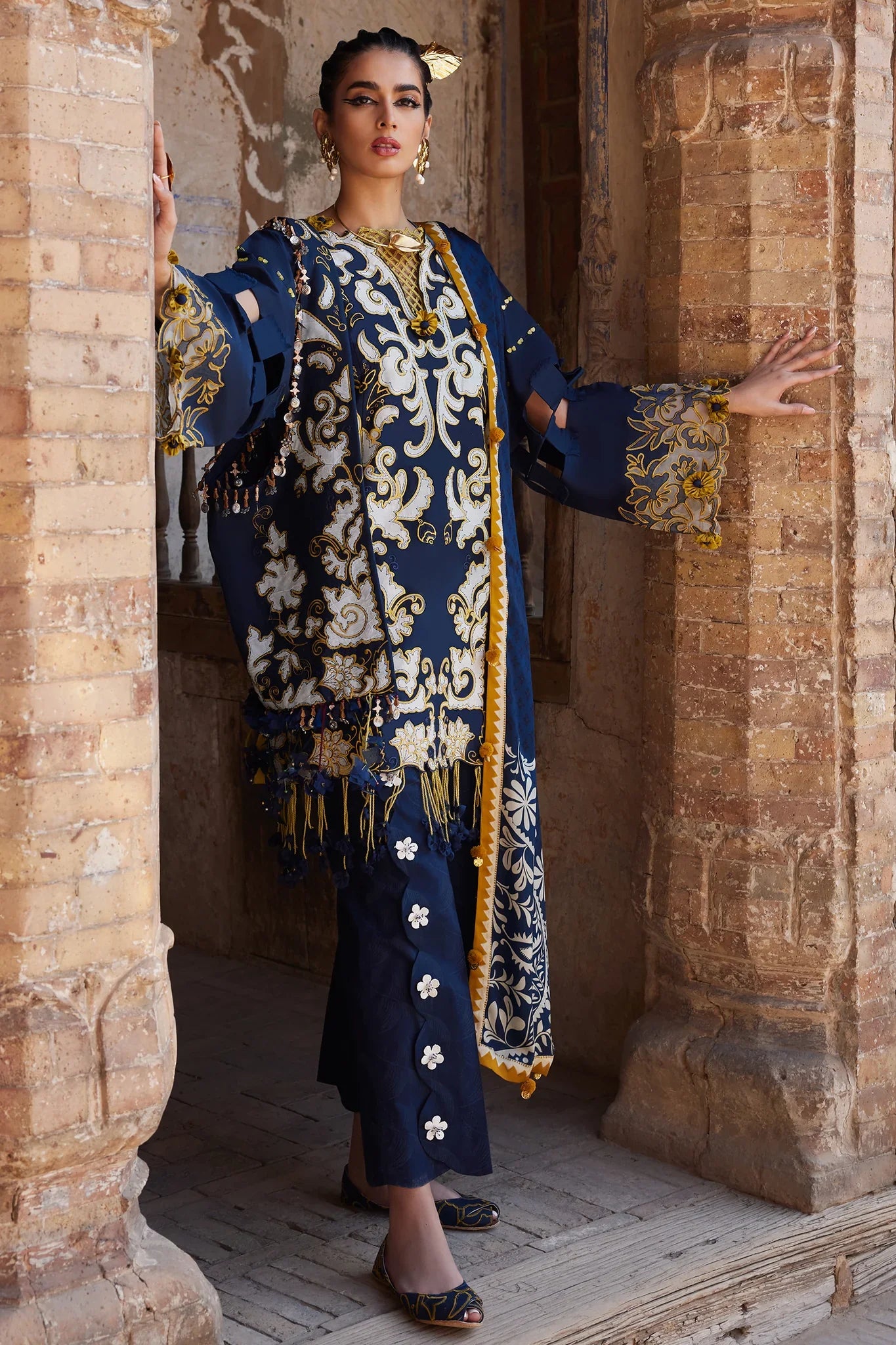A gentle homage to heritage, Solene blooms like first light in a quiet garden—where dawn softens shadows and petals stir awake. Set against a midnight blue canvas, delicate florals in fine running stitches and mustard accents trace nature’s early poetry.
