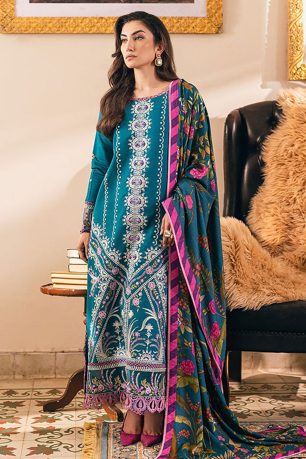 Embrace the cozy charm of autumn with our Spiced Maple ensemble in rich teal. Featuring intricate embroidered karandi and a vibrant printed shawl, it’s the perfect blend of warmth and style for those crisp fall days.