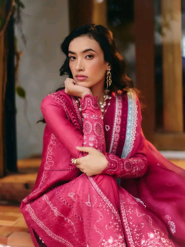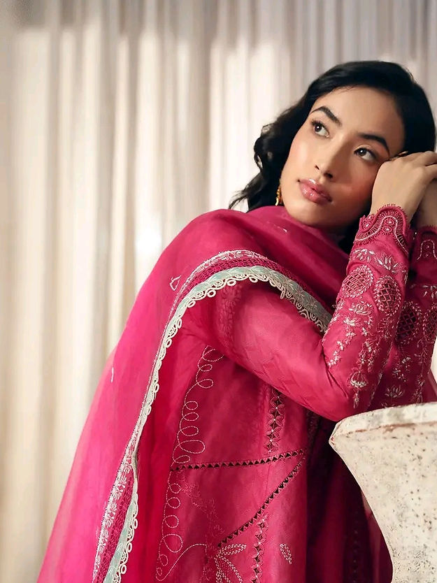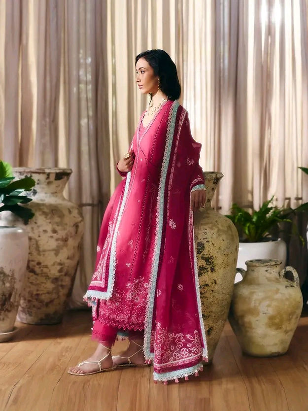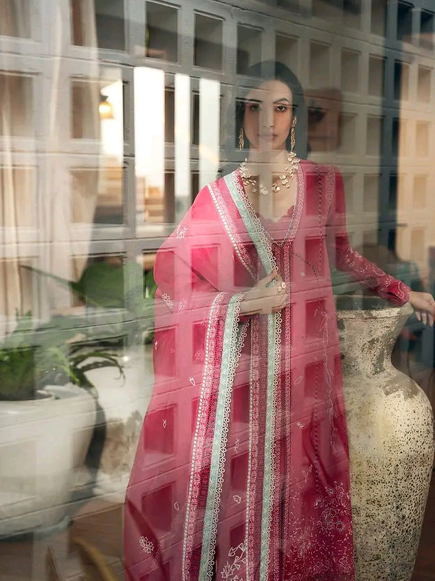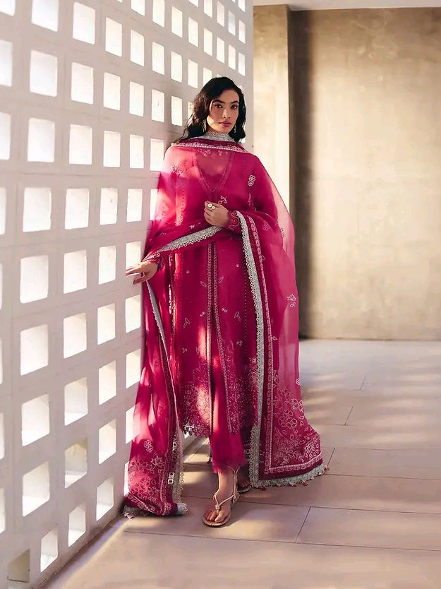 • Organza dupatta, embroidered and then finessed with a contrasting ice blue four sided border. Finished with lacework and tassel