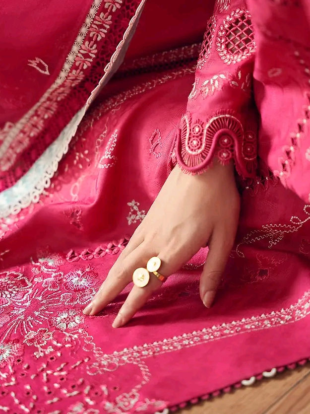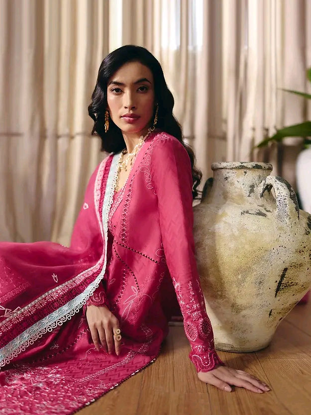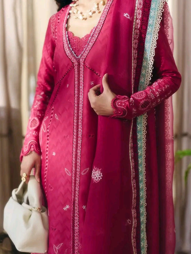 • Coral pink front open, pure cotton jacquard shirt with a layered neckline enhanced by lacework and net. Self and off-white embroidery with hints of ice blue. Fitted sleeves finished with laces and stitching details.