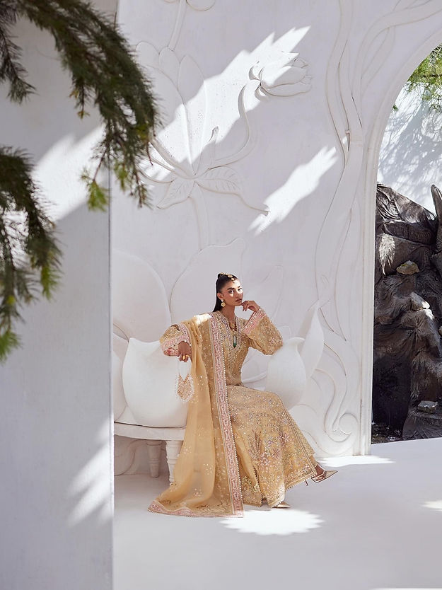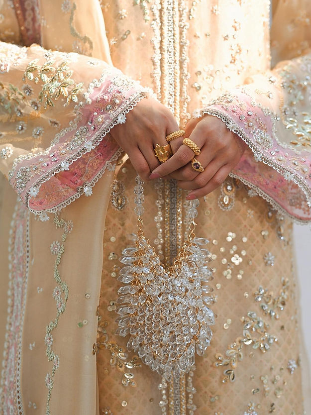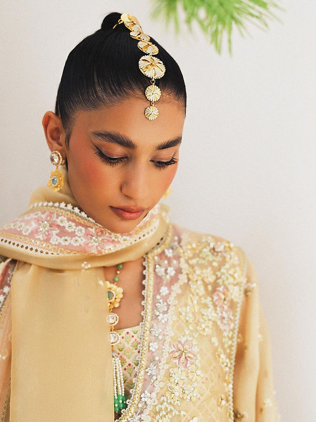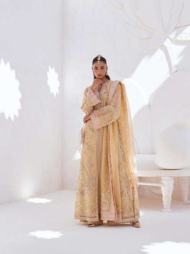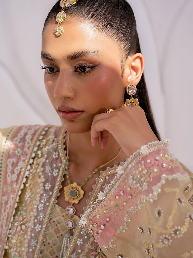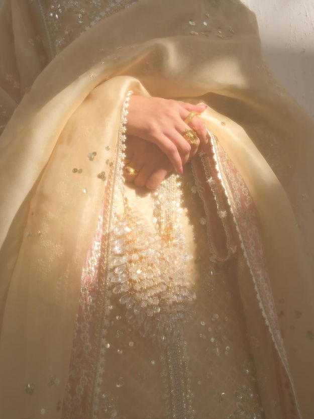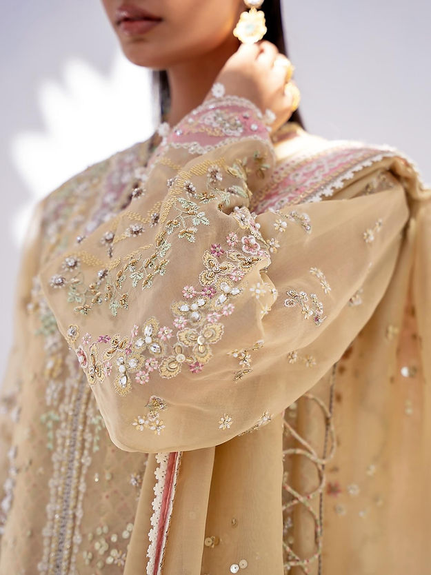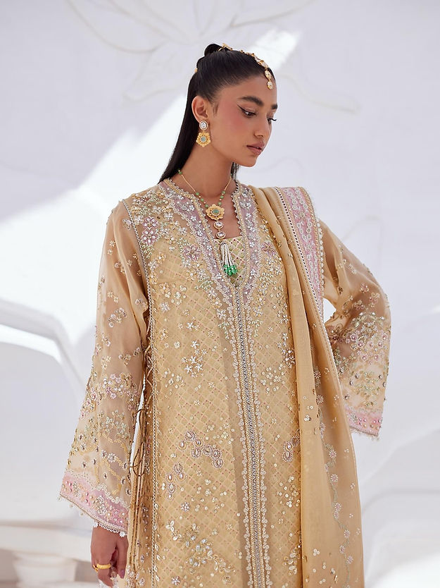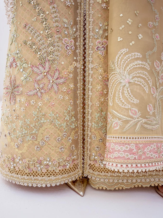 - Embroidered organza dupatta, four sided border with pink details.