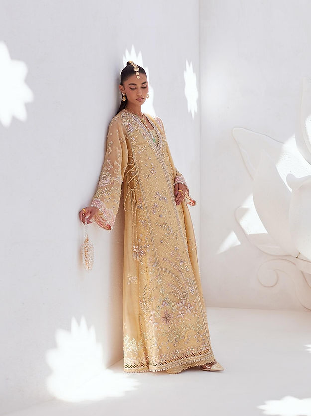- Marigold yellow straight front open panelled shirt, tassels on the side after winding stitch work and sleeves, and a pointed U neckline, shirt has pink embroided pathwork on neckline and sleeves lacework and patchwork on hem and a printed raw silk slip.