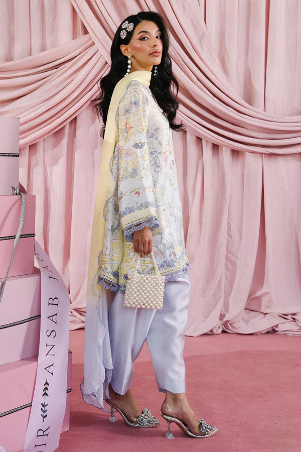 A short raw silk shirt featuring pearly neckline detailing, enhanced with subtle cut-dana and pearl embellishments over a fresh, bloomy print. Paired with a Sheesha silk narrow shalwar and finished with a medium silk gradient scalloped dupatta for an elegant, refined look.