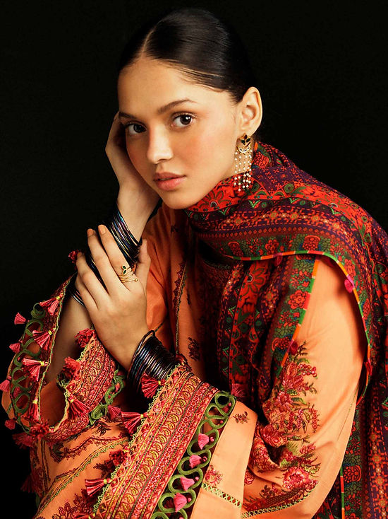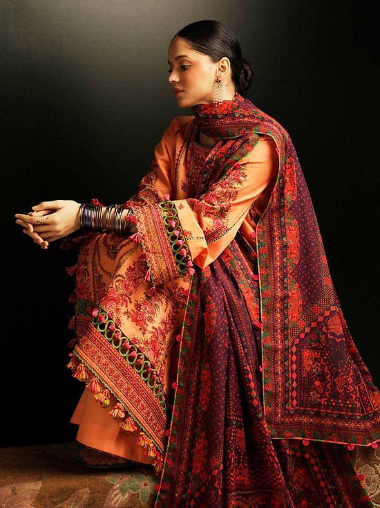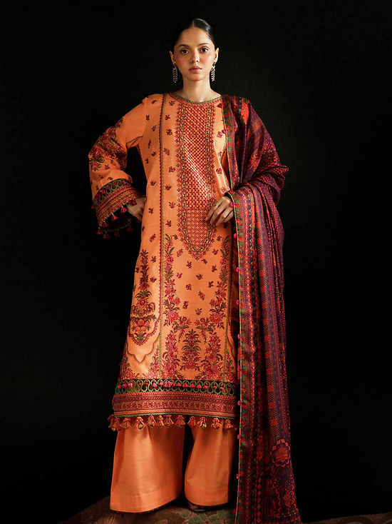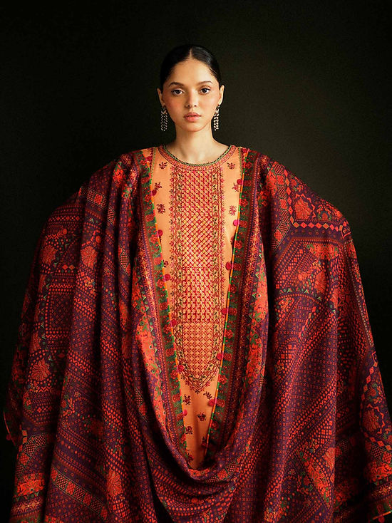 A lovely peach color that features intricate criss cross design on the neckline that beautifully plays the design role of the outfit. It is heavily embroidered with shades of pink and green. And to complete the look, there is a beautiful magenta woolen printed shawl that adds a pop of color and style. Its a perfect combination of grace and charm.