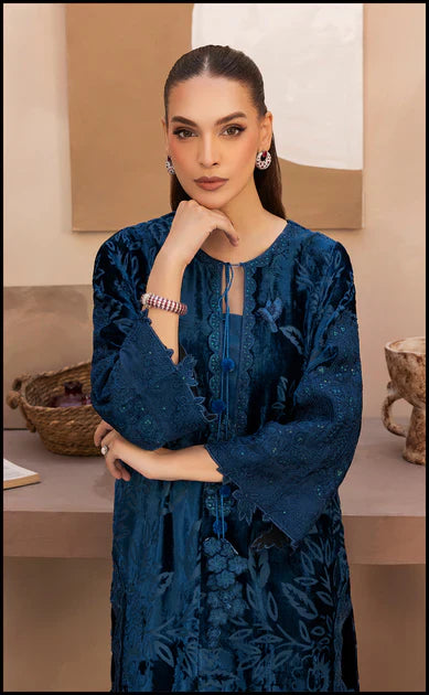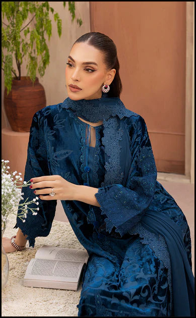 Immerse yourself in the elegance of Teal Temptation — a three-piece embroidered velvet ensemble that blends regal charm with contemporary grace. The shirt is exquisitely detailed with intricate tonal embroidery, accentuating the neckline, sleeves, and hem with finesse. Paired with matching trousers and a delicately embellished dupatta featuring ornate borders, this ensemble captures the essence of winter luxury.