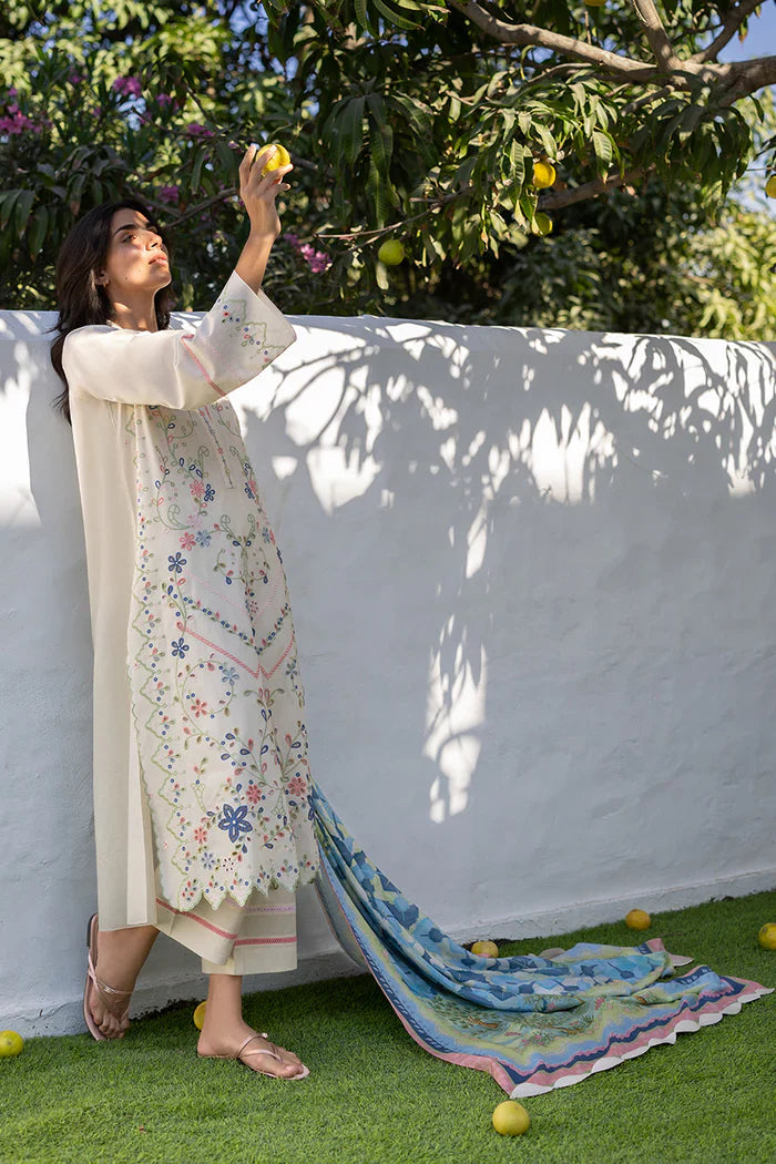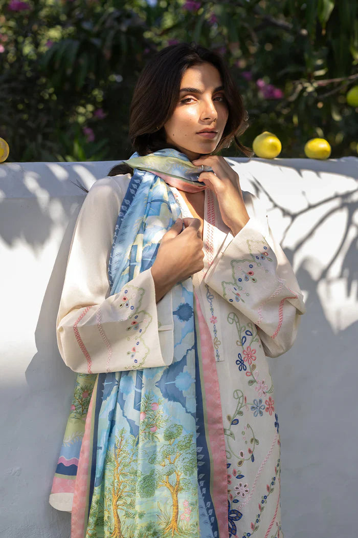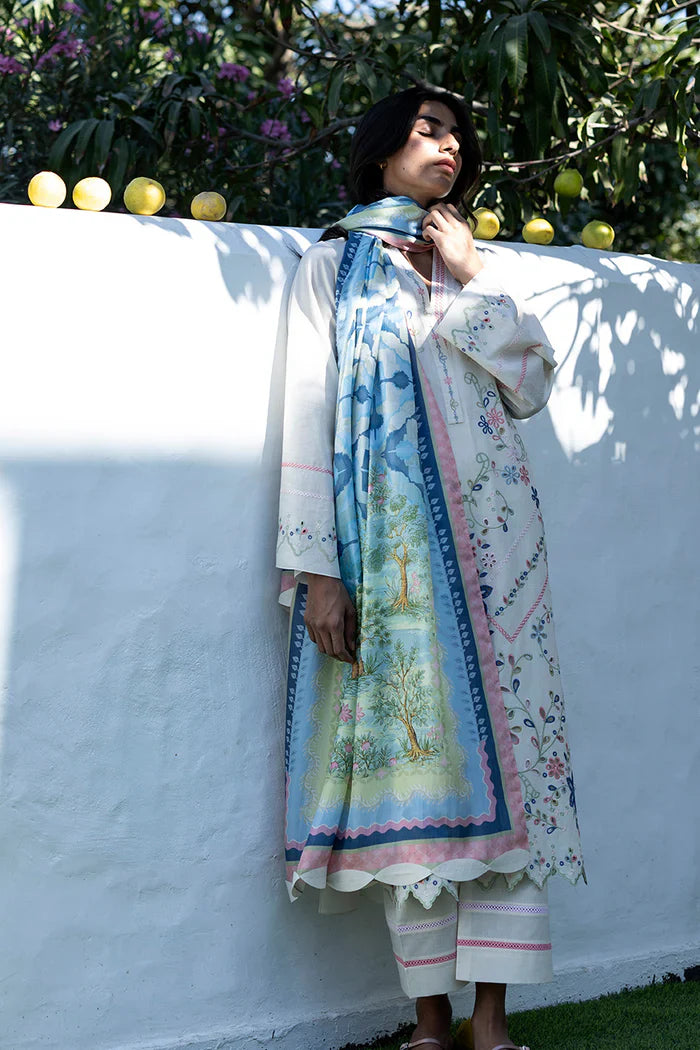 Quietly elegant in mood, an ivory jacquard lawn shirt is adorned with botanical embroidery in a gentle pastel palette, accented by eyelet detailing along the neckline and front. A scalloped embroidered hem lends a refined finish. The look is paired with matching jacquard lawn culottes, finished with fine embroidery along the hem. A printed medium silk dupatta completes the ensemble, carrying a scenic floral composition in shades of pistachio, celadon, and soft blush, finished with whimsical English garden motifs at either end.