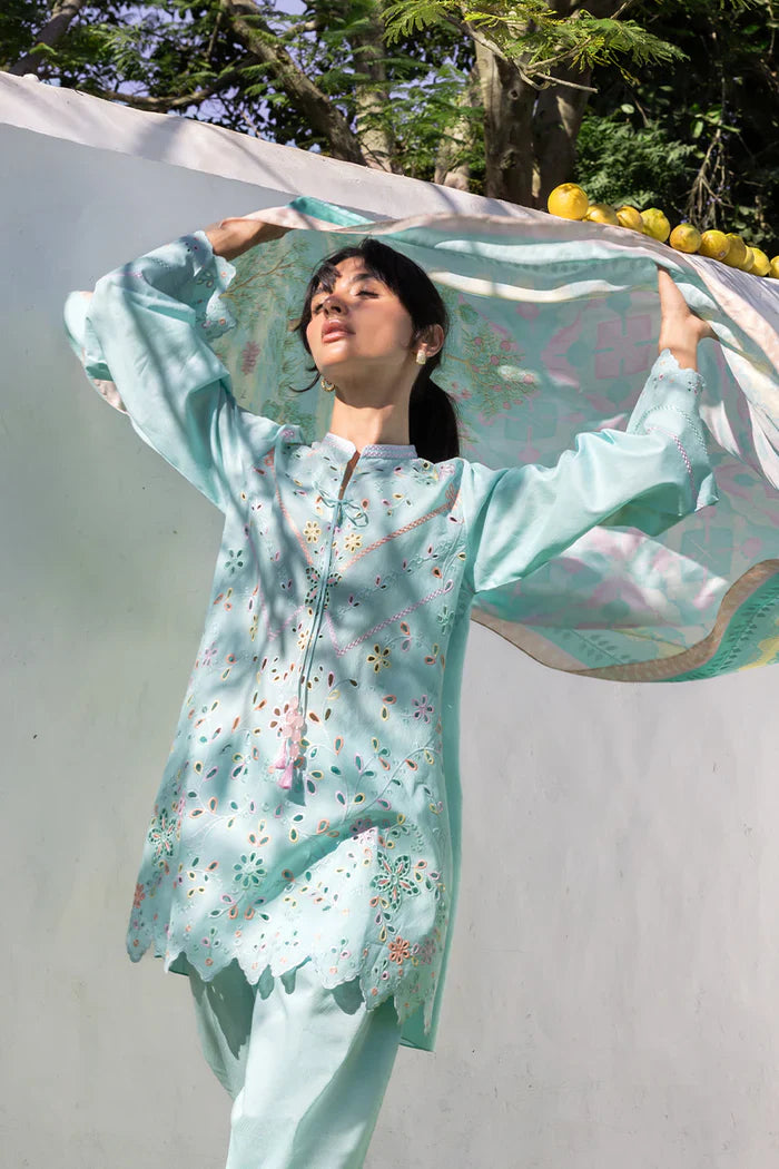 Light and serene in mood, an aqua jacquard lawn shirt is adorned with botanical embroidery in a soft pastel palette, accented by eyelet detailing along the neckline and front. A scalloped embroidered hem lends a refined finish. The ensemble is paired with a matching jacquard lawn shalwar, finished with fine embroidery along the hem. A printed medium silk dupatta completes the look, showcasing a scenic floral composition in shades of pistachio, celadon, and soft blush, finished with whimsical English garden motifs at either end.