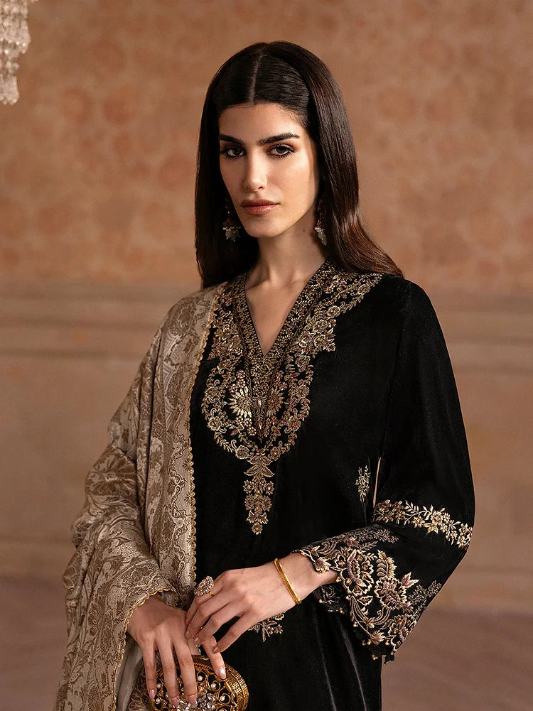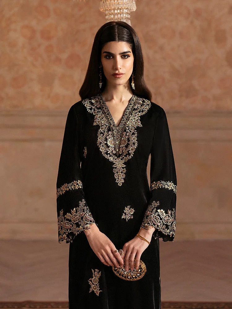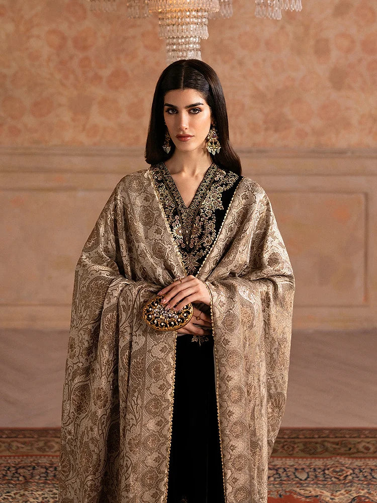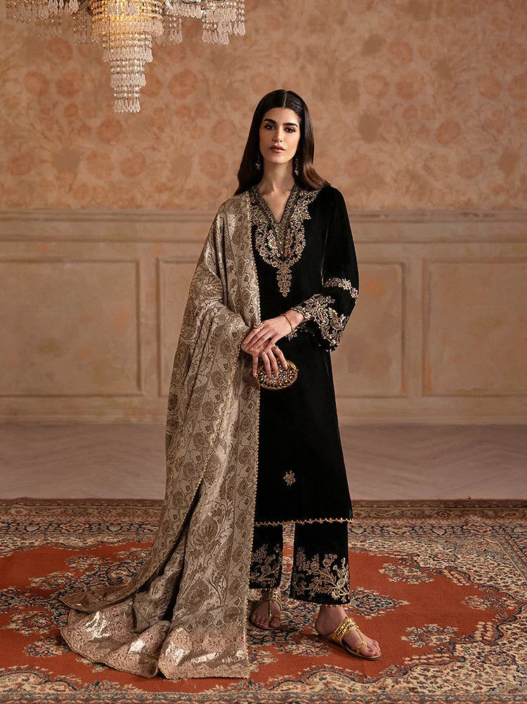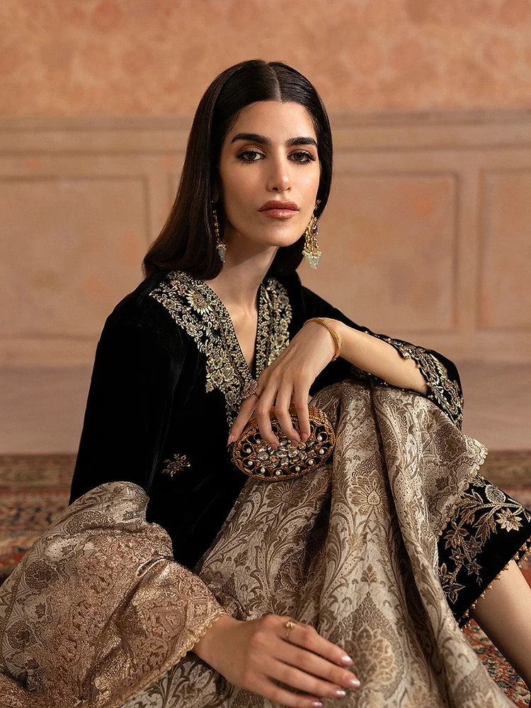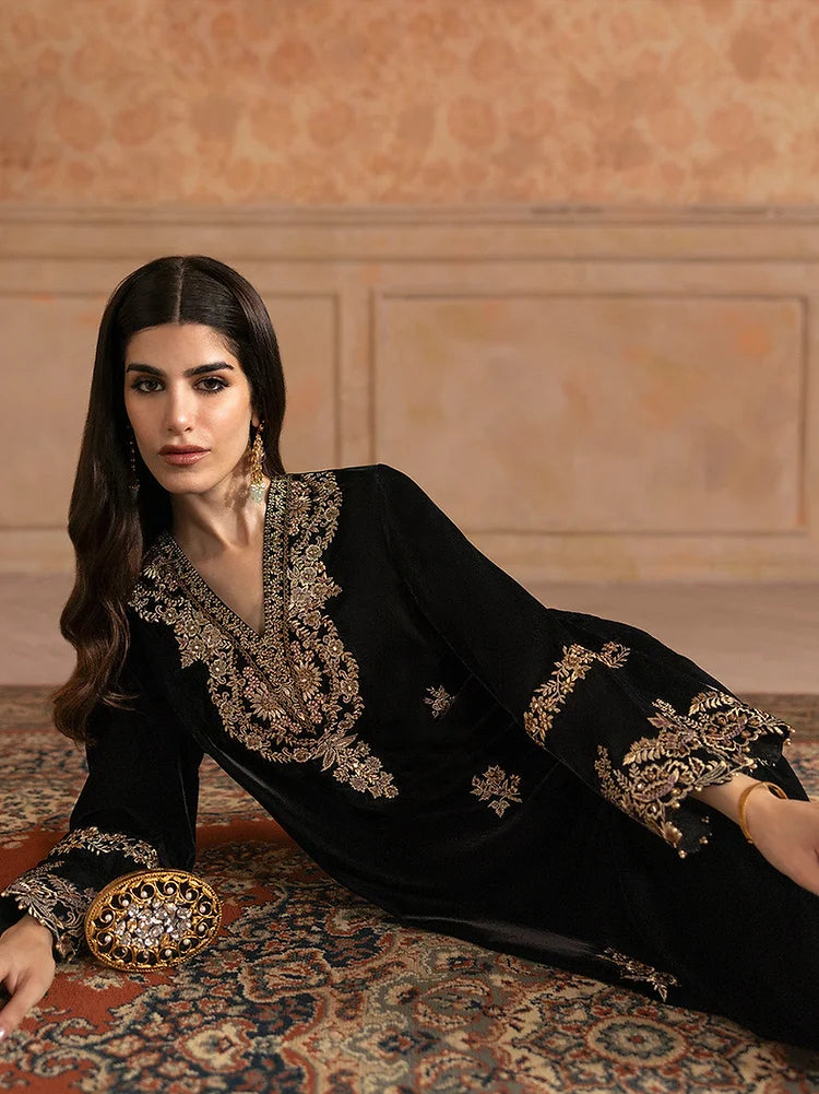 Capturing the true essence of timeless crafts, Vita showcases opulence and artistic flair. Crafted on black velvet, the shirt and trousers feature a majestic web of floral motifs wrought using tilla and resham stitches. Adding a layer of refinement and visual interest to the outfit is a dazzling spray of mirror work. This set includes a contrasting ivory embroidered shawl, making it a versatile addition to your festive wardrobe