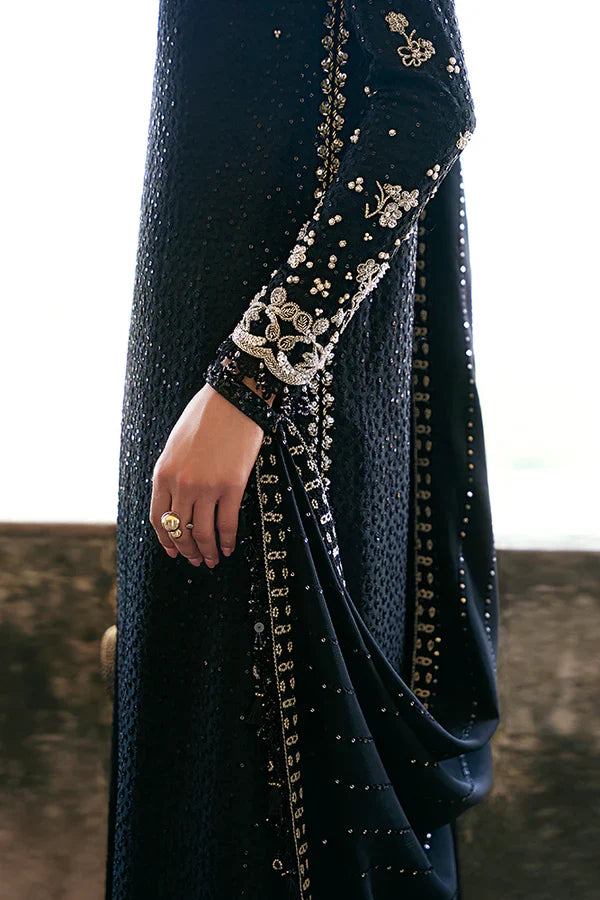 - Midnight Black, silk A-line shirt featuring a box pleat and a keyhole neckline. It has fitted sleeves adorned with embroidery that branches upward towards the arm. The shirt has an all-over textured design, with details highlighted in contrasting embroidery. The sleeves also feature tassels.