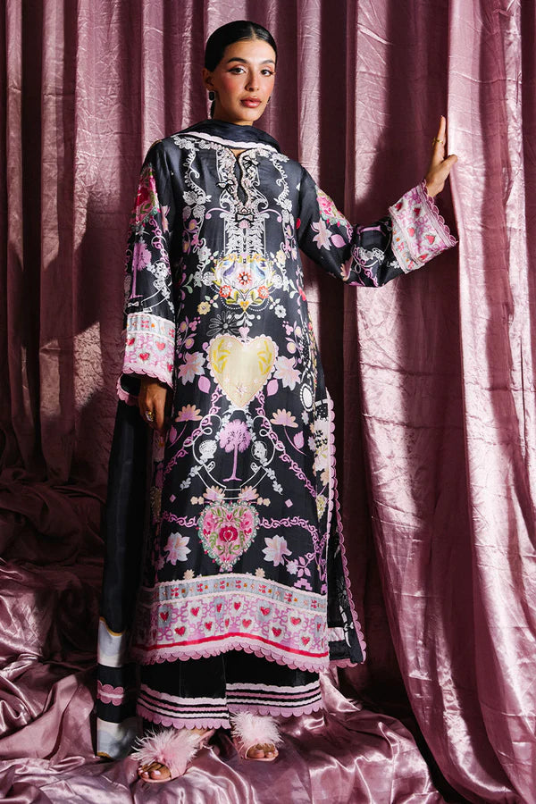 A timeless black long shirt elevated with an embellished neckline, delicately finished with bow details for a touch of understated glamour. Intricate lace detailing adds depth and refinement to the silhouette, enhancing its elegant appeal. Paired with a medium silk dupatta featuring a printed border and lace accents, the look is completed with luxurious sheesha silk pants adorned with subtle lace detailing. A classic ensemble that blends sophistication with modern femininity.